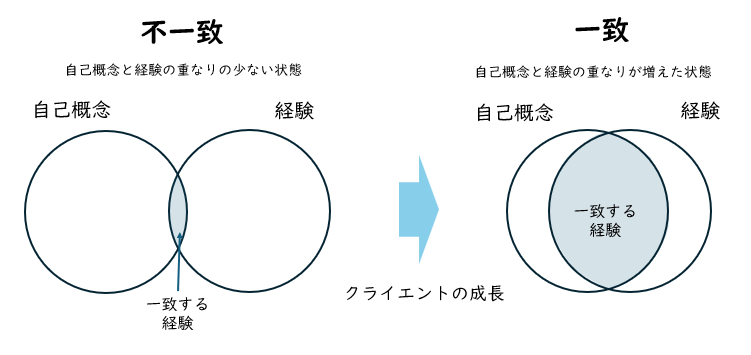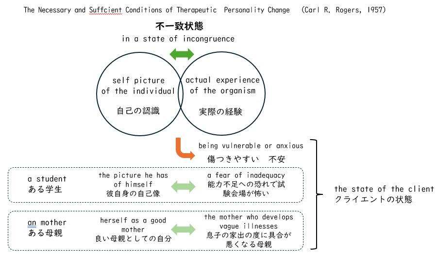 ロジャーズの自己一致・不一致も次の図のような説明がされていると思います。この論文では、「大学の試験に対して彼の自己像と能力不足ではないかと言う不一致から、彼の意識の中で試験の三階へ登る事の身体的恐怖と感ずる」と「良い母であるべきとの自己像に対して、一人息子が家出をする度に本当は手放したくない思いの不一致から具合の悪くなってしまう」の2つのケースを挙げています。
