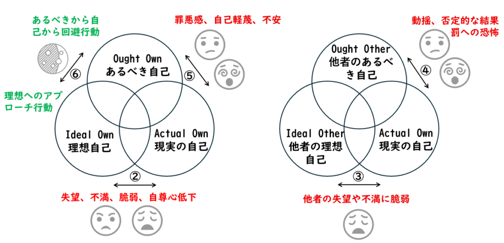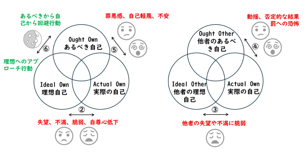 理想自己とあるべき自己は、実際の自己がそれに沿おうとする自己の指針として機能します。理想自己は希望や願望を表し、一方であるべき自己は義務感や責任感によって決まります。理想自己とあるべき自己のギャップに関して、また自己調整的なアプローチ行動と回避行動に特化して言えば、理想の領域はアプローチ行動に傾き、あるべきの領域は回避行動に傾く傾向があります。