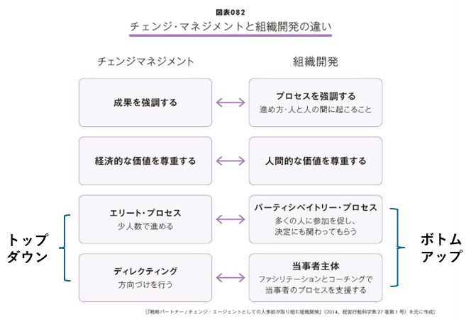 変革の取り組み方がチェンジマネジメントはトップダウンで組織開発はボトムアップ、下図(坪谷邦生 2020「図解人材マネジメント入門」図解082 p.350に加筆)のような違いがあります。