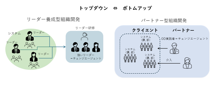 つまりチェンジマネジメントはGE(ゼネラル・エレクトリック社)に代表される、 エリートのリーダーを養成し、リーダーが指示的に組織開発に取り組むという「リーダー養成型組織開発」に対応し、上図の組織開発は組織内の当事者が主体でチェンジエージェントとして外から介入・支援を行っていく「パートナー型組織開発」に相当しています。