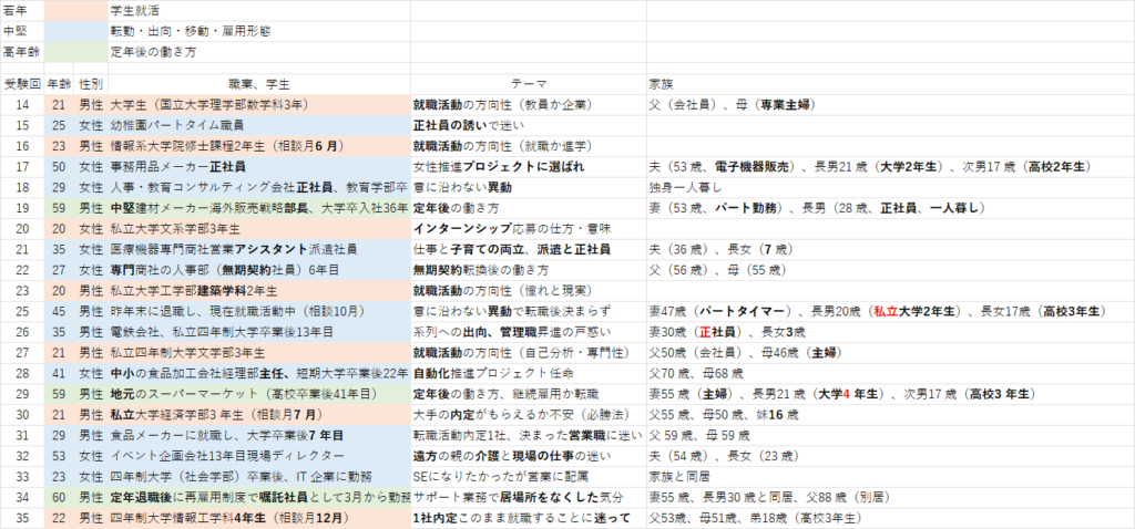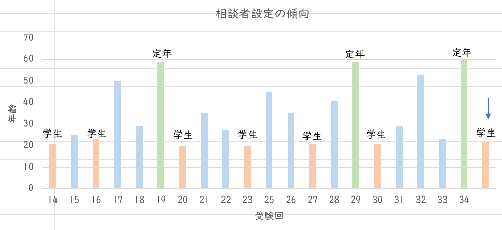 相談者の年齢は、若者(学生就活)、中堅、高年齢が受験回に応じてほぼ周期的に表れています。就活のタイミングの33回で入社間もない新人が来ましたが、今回遅れて就活生になりました。